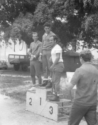 Después de concluir el curso de instructores se hizo una competencia de paracaidismo en la cual se premiaron el primer, segundo y tercer lugar. En este caso, el primero fue Francisco G. Quintino, el segundo fue Raúl Roque y el tercero fue Juan F. Moreno Guerra. A la derecha de la imagen aparece el asesor soviético Biacheslav Jarikov Slava. Esta imagen fue hecha en el año 1972.